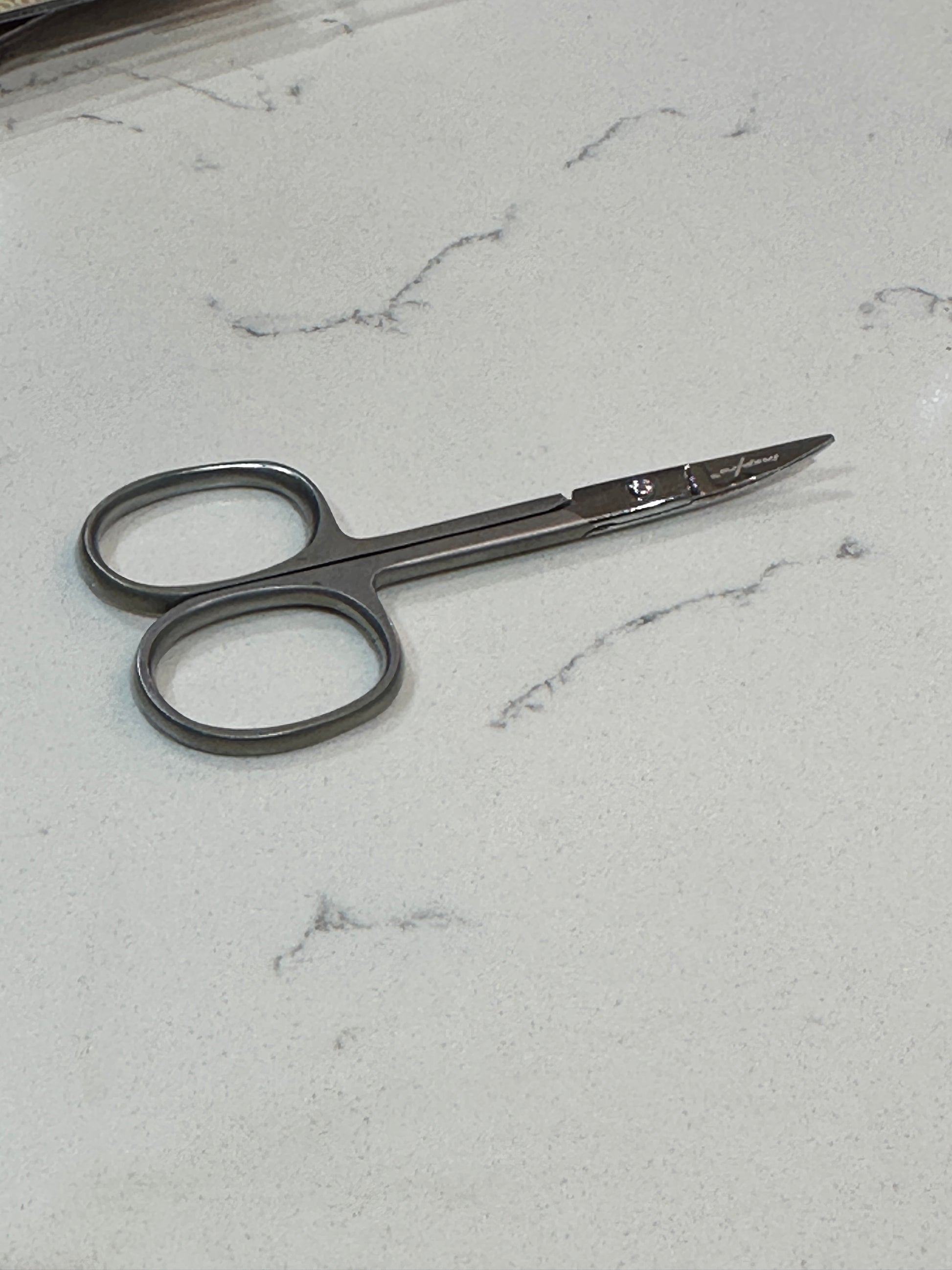 These fine tipped scissors are slightly curved to prevent the snagging of fabric when trimming threads.